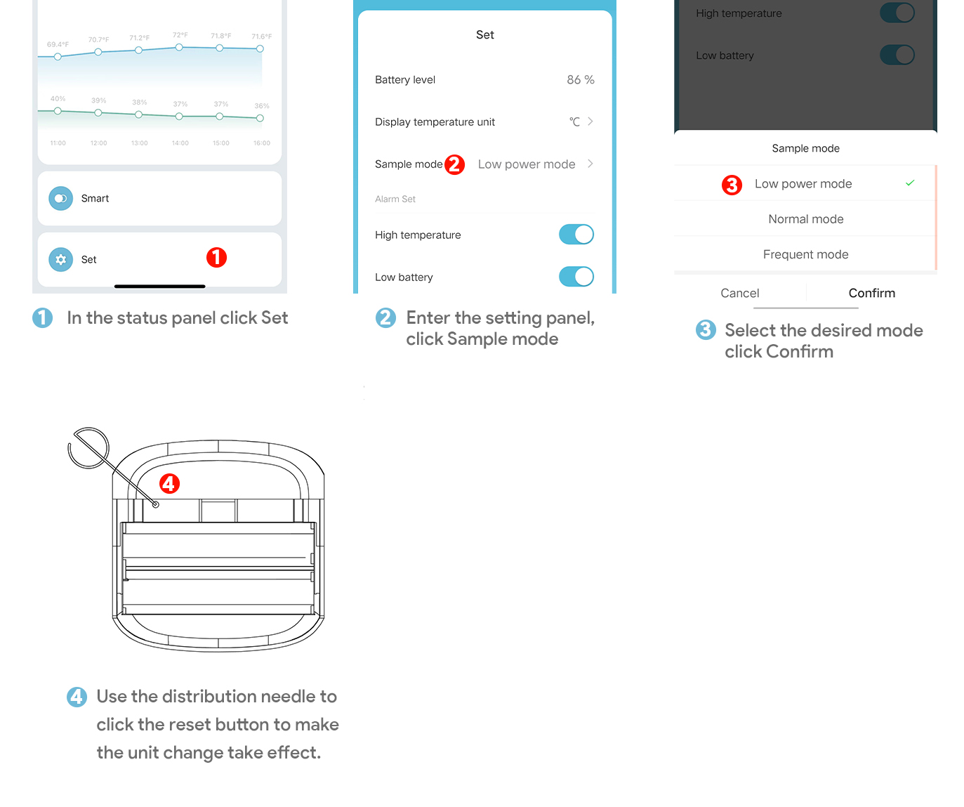 If you need to change the sampling mode, please enter the device panel and click the setting bar to switch; during the switching process, you can choose to use the needle and press the reset button for 1 second until the indicator light is on, release it to make the unit take effect, or wait for the device itself to report next time Automatically take effect