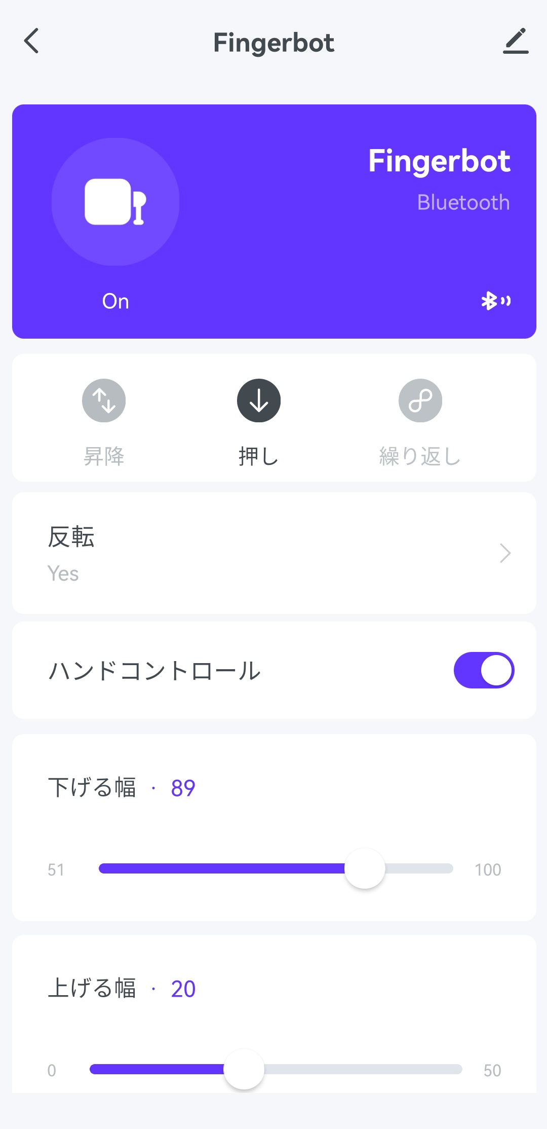 デバイスが正常に接続されたら、 Fingerbotを表すボタンがデバイスコレクションパネルに表示されます。 タップすると、Fingerbotのデバイスコントロールページに移動することになりします。ここで、デバイスモードやアームの動きの設定などの調整ができます。